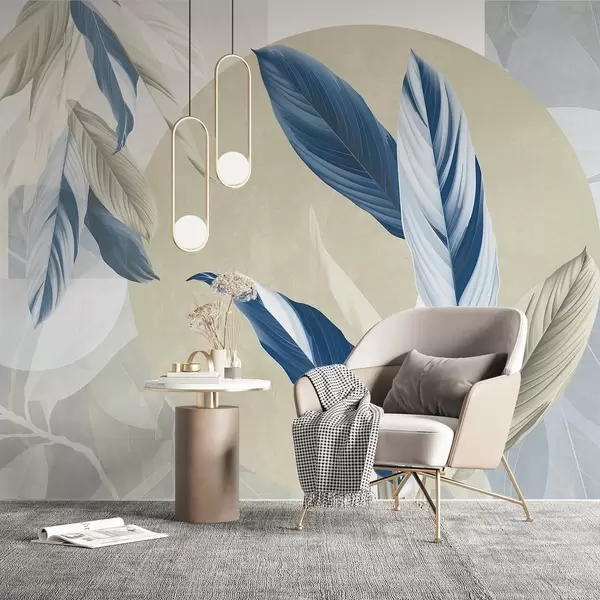 Modern and abstract geometric textural composition with detailed leaves in shades of blue, beige and white - Wall mural (No. w08741)