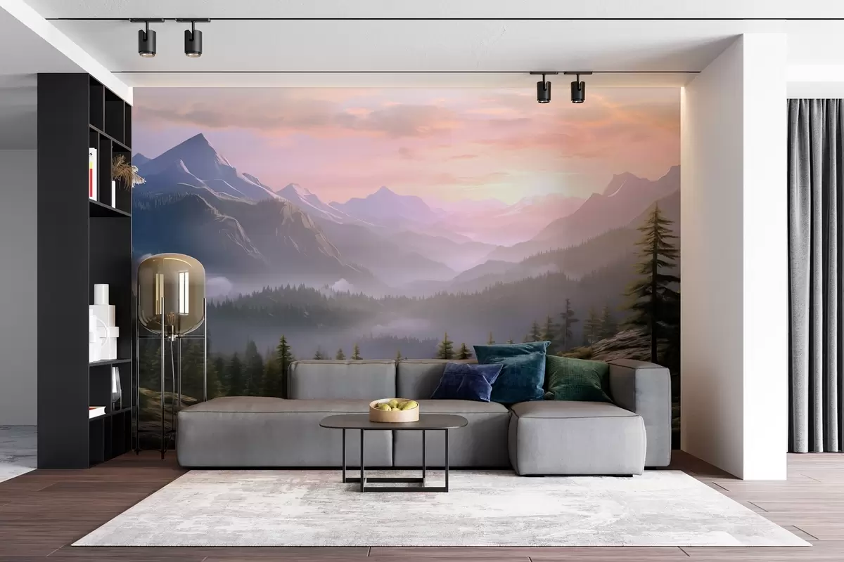 Serene mountain landscape at dawn with soft mist against a forest backdrop - Wall mural (No. w08750)