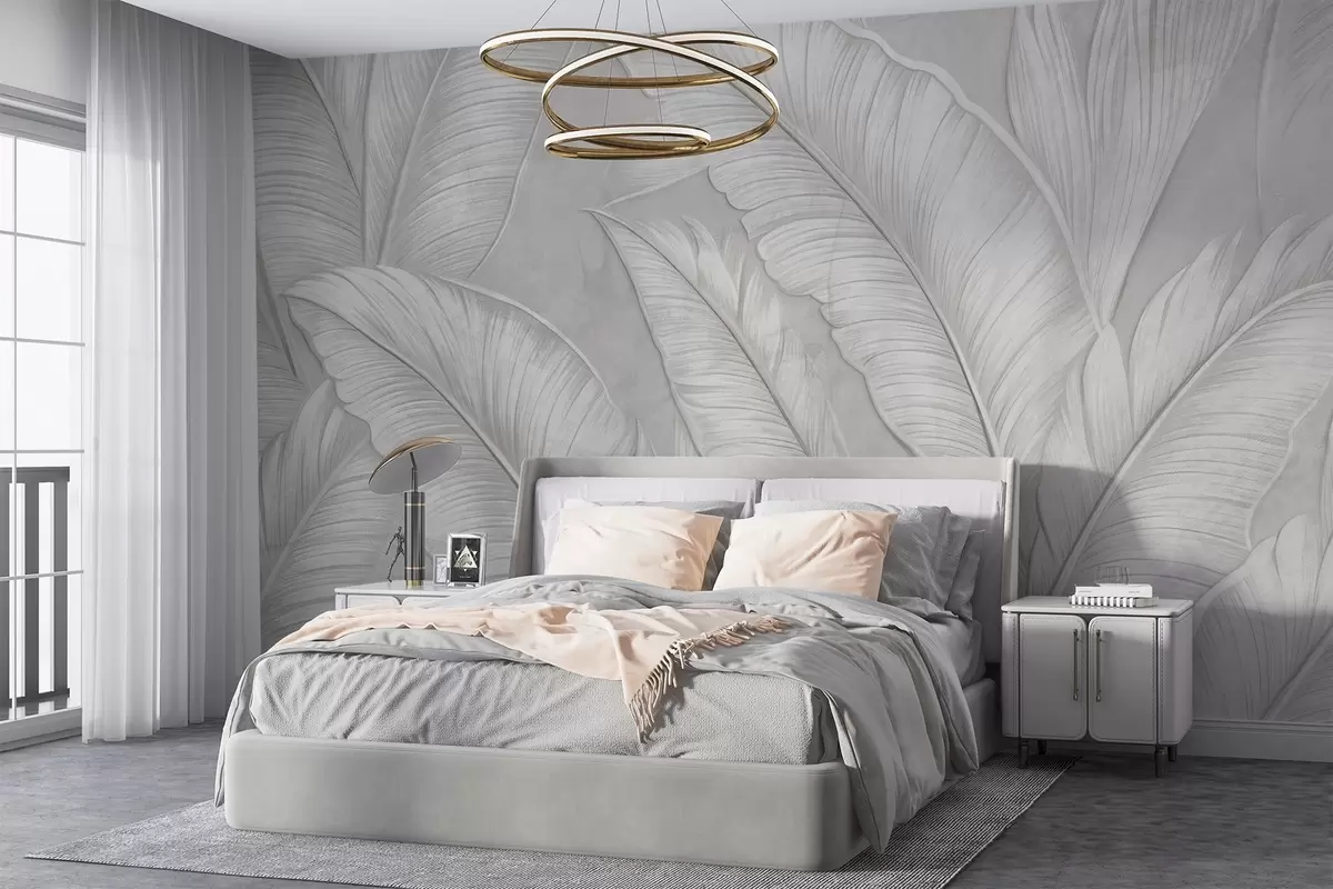Highly-textured detailed large tropical leaves in a monochromatic light gray color in loft style - Wall mural (No. w08772)