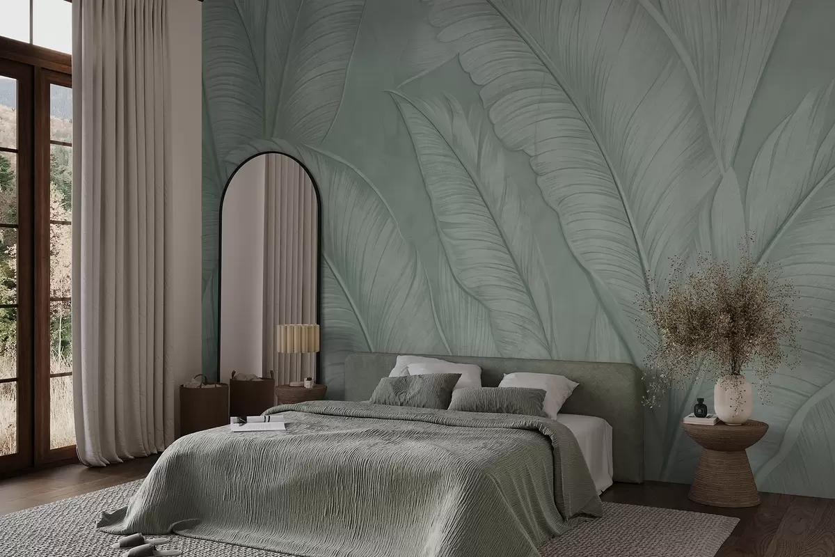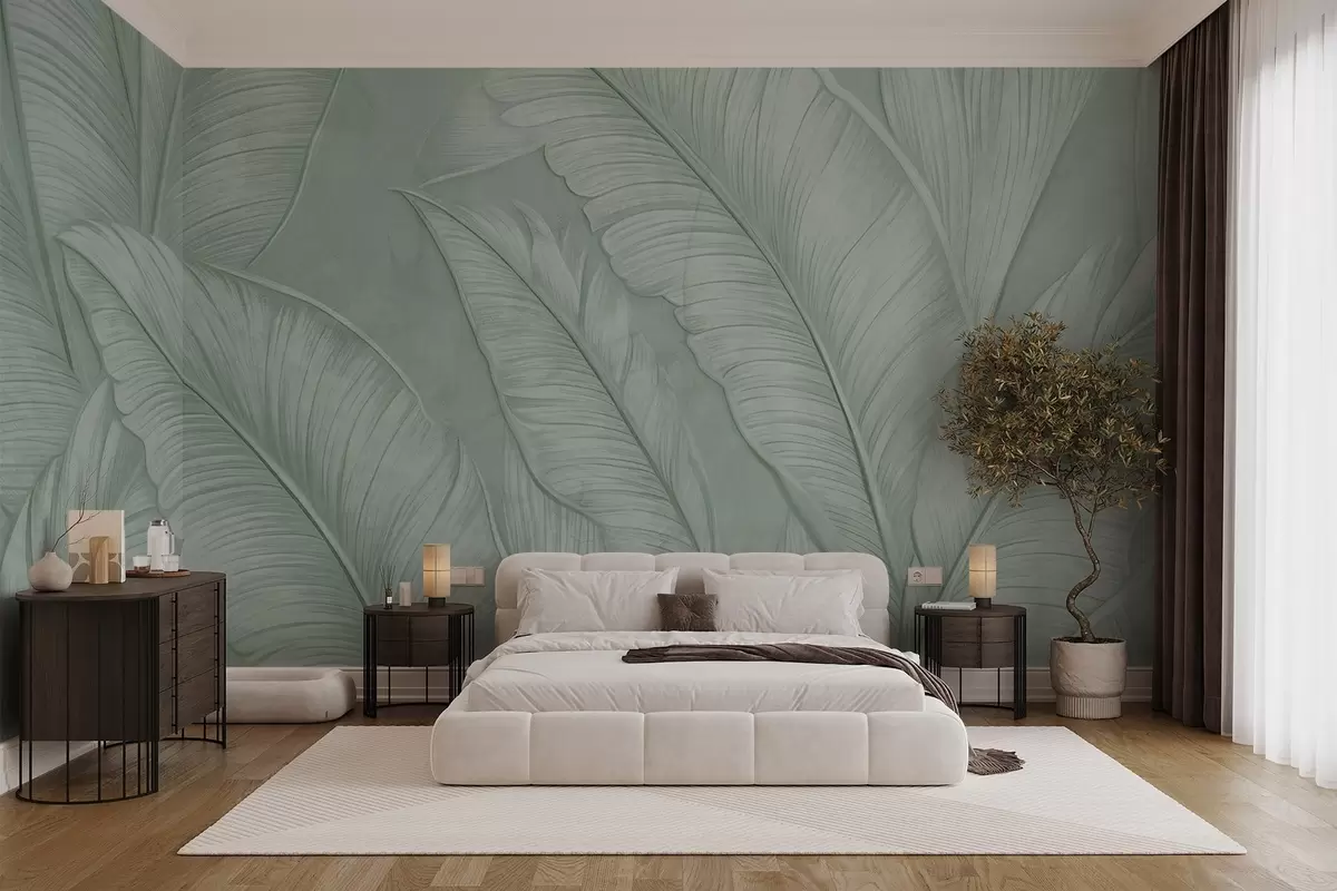 Highly-textured detailed large tropical leaves in a monochromatic green color in loft style - Wall mural (No. w08772v1)