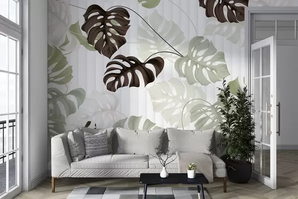Monstera leaves in shades of green, white and dark brown, against a light, striped-textured background - Wall mural (No. w08773)
