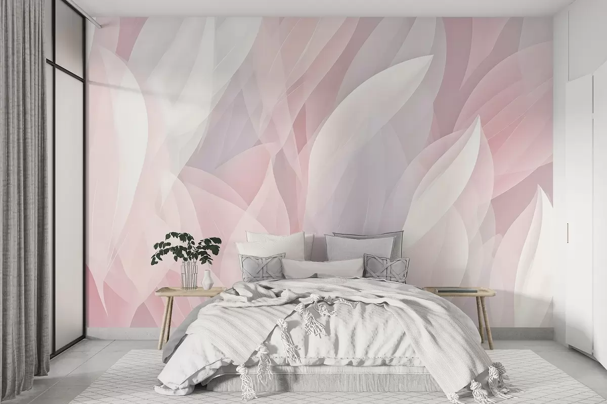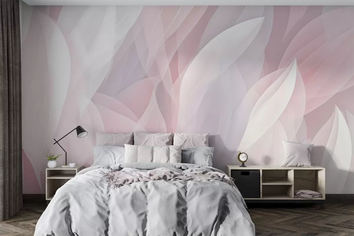 Abstract design featuring soft petal-like shapes in shades of pink and white, creating a layered effect - Wall mural (No. w08774)
