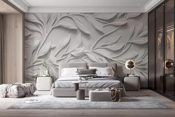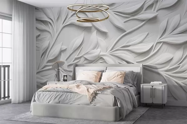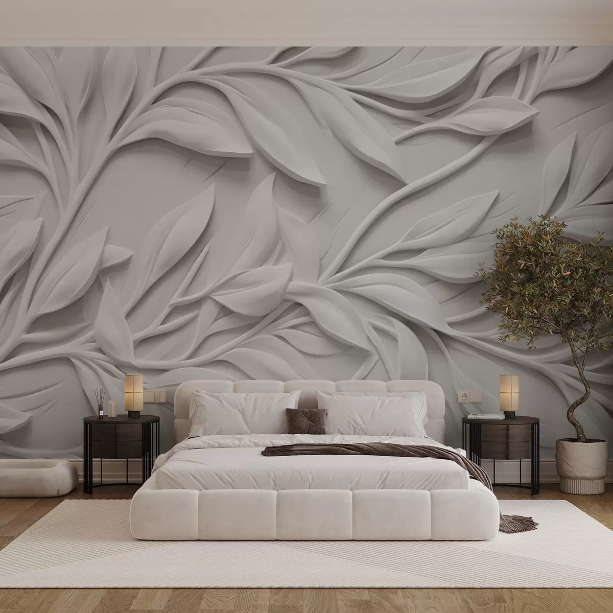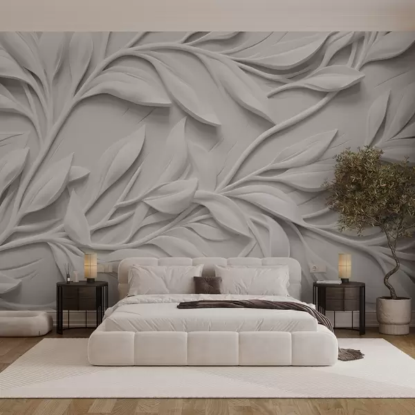 White textured print with leaves and branches , creating a volumious imitation effect on a textured background - Wall mural (No. w08778)