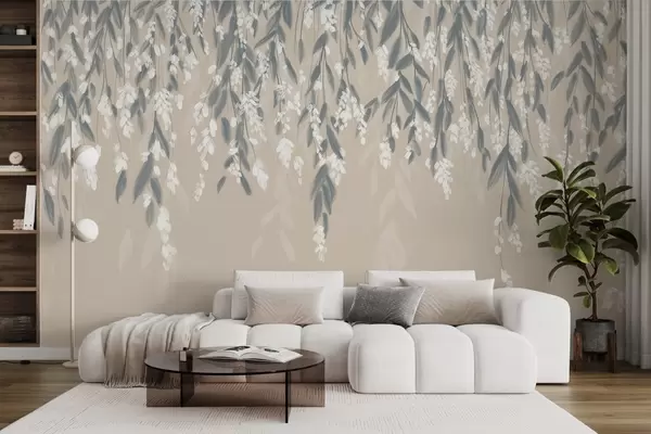 Cascading foliage branches in shades of muted green with white flowers and leaves on beige background - Wall mural (No. w08781)