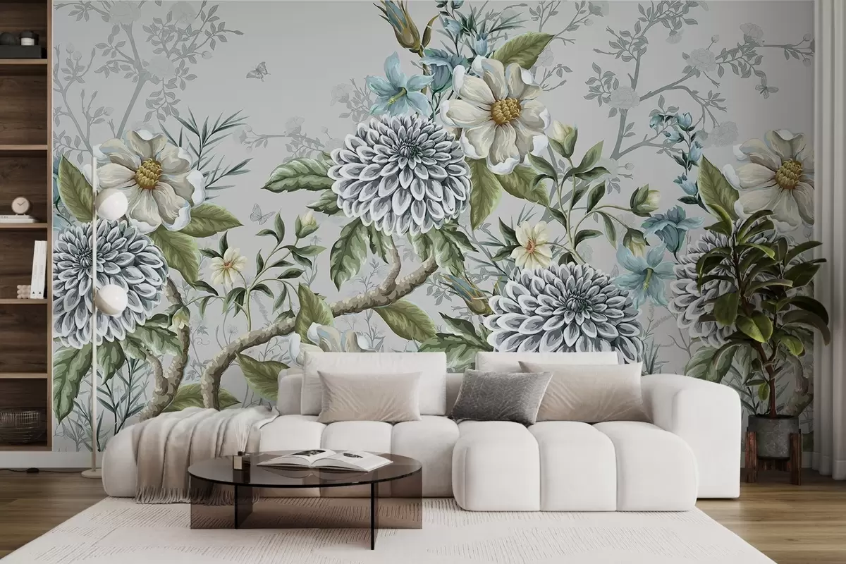 A floral print featuring chrysanthemums, delicate blue flowers, and green leaves intertwined with branches - Wall mural (No. w08782)