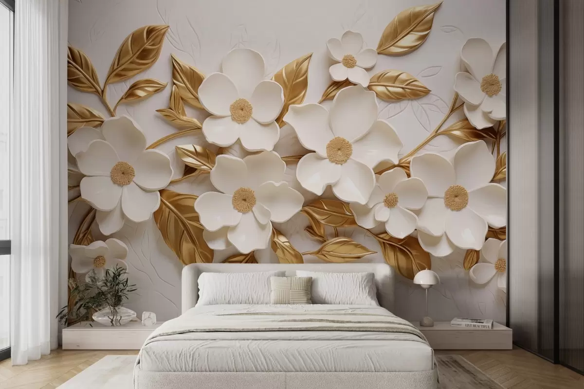 3D white flowers with yellow embossed leaves - Wall mural (No. w08814)