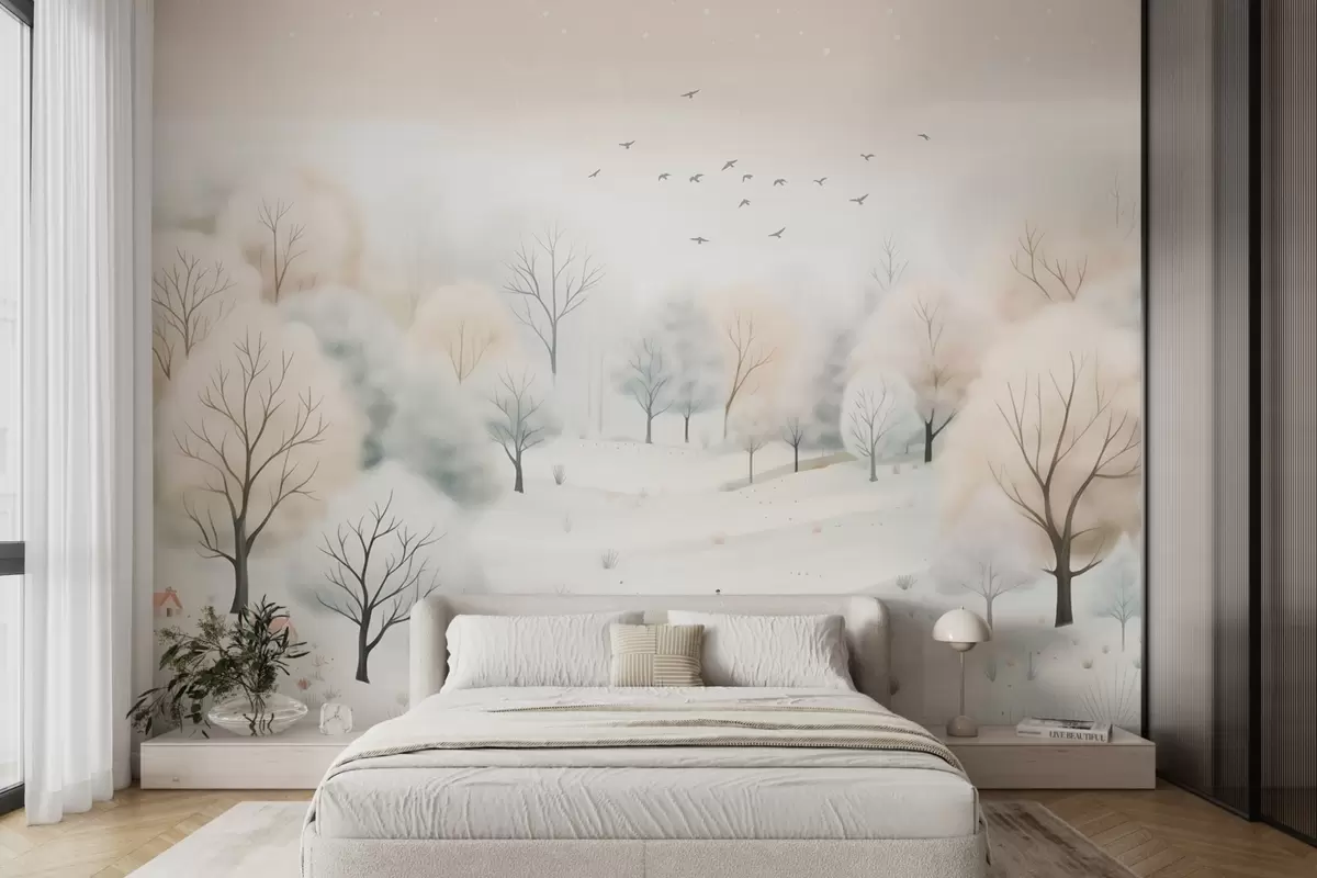 Winter forest with trees, small houses, birds, and snow in a light watercolor style - Wall mural (No. w08815)