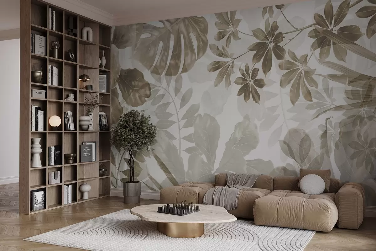 Tropical beige delicate leaves on a white background - Wall mural (No. w08824)