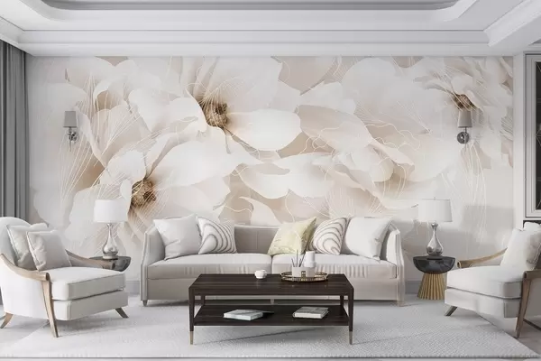 Pastel peony flowers with white and beige delicate petals and white lines on a light beige background - Wall mural (No. w08826v1)