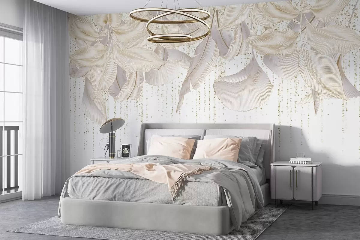 White detailed tropical leaves and yellow dotts texture on a white background - Wall mural (No. w08836)