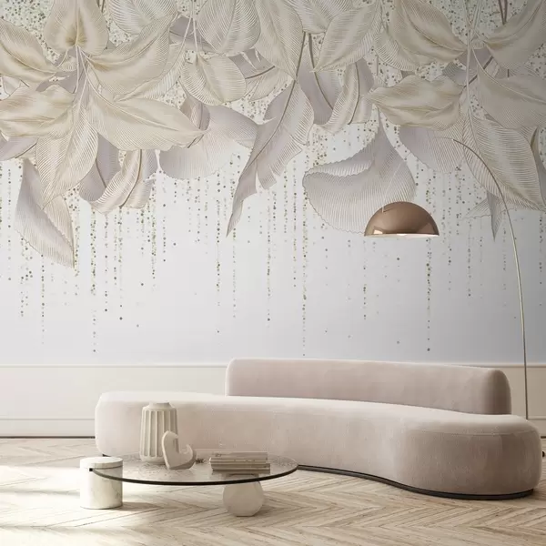 White detailed tropical leaves and yellow dotts texture on a white background - Wall mural (No. w08836)