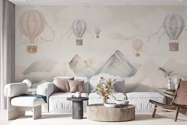 Hot air balloons floating above mountains in neutral, soft pastel tones - Wall mural (No. w08853)