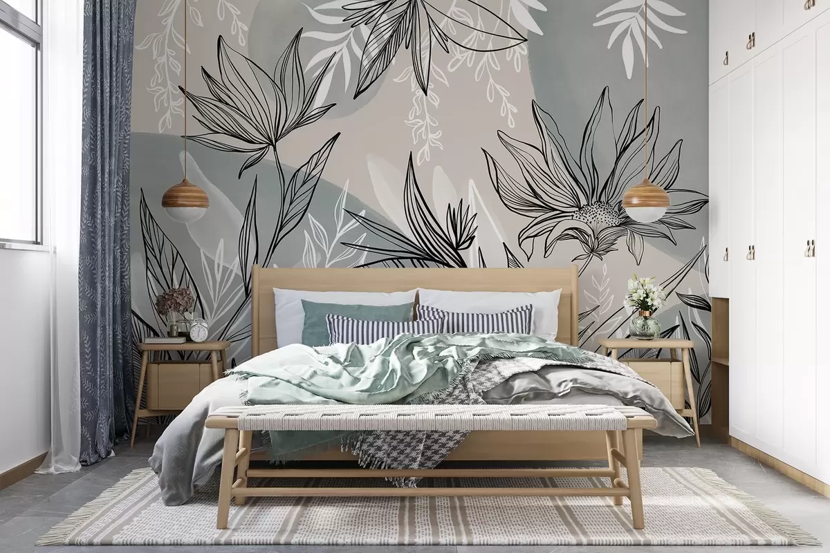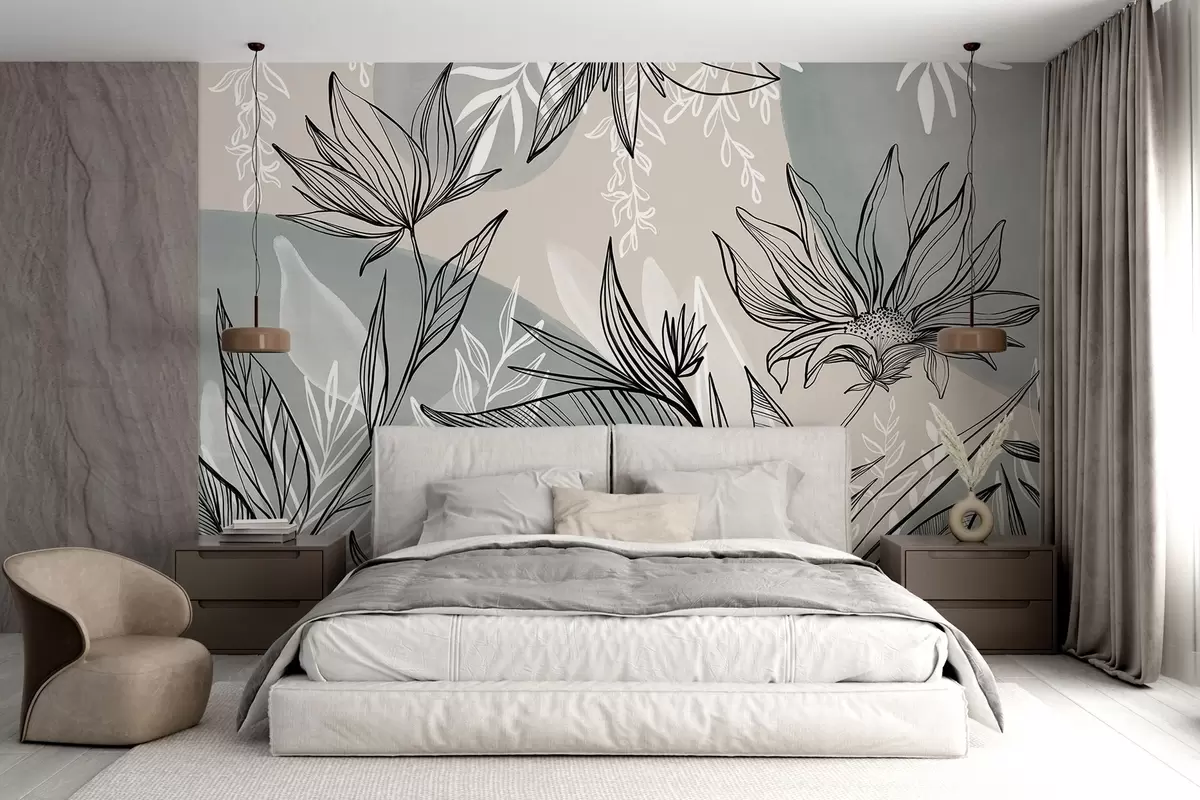 Floral line art with large leaves and flowers, against a background of beige and blue watercolor washes - Wall mural (No. w08865)