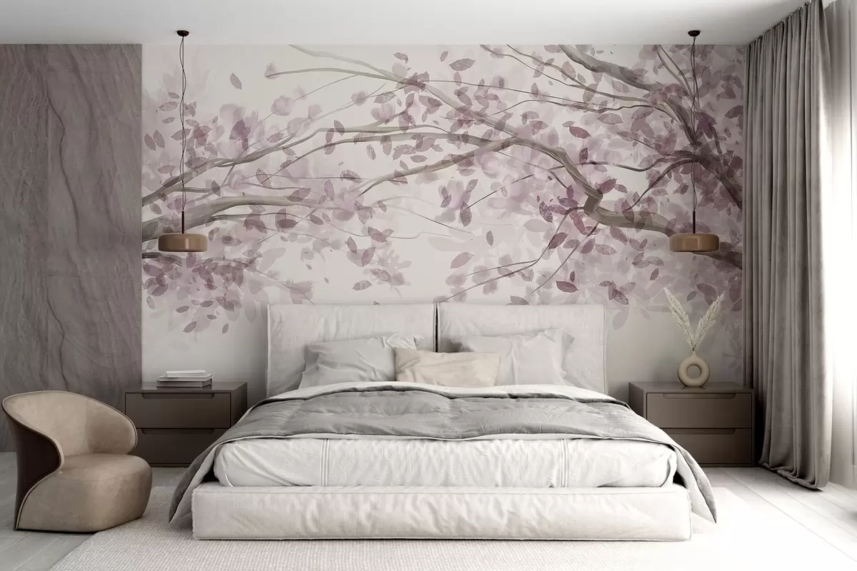 Blossom branches with pink leaves, soft colors, delicate details, watercolor style, against a light background - Wall mural (No. w08867)