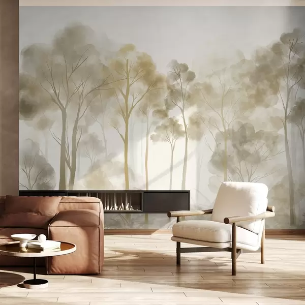 Watercolor style forest with tall light-colored trees in shades of beige and yellow, with a foggy atmosphere - Wall mural (No. w08870)