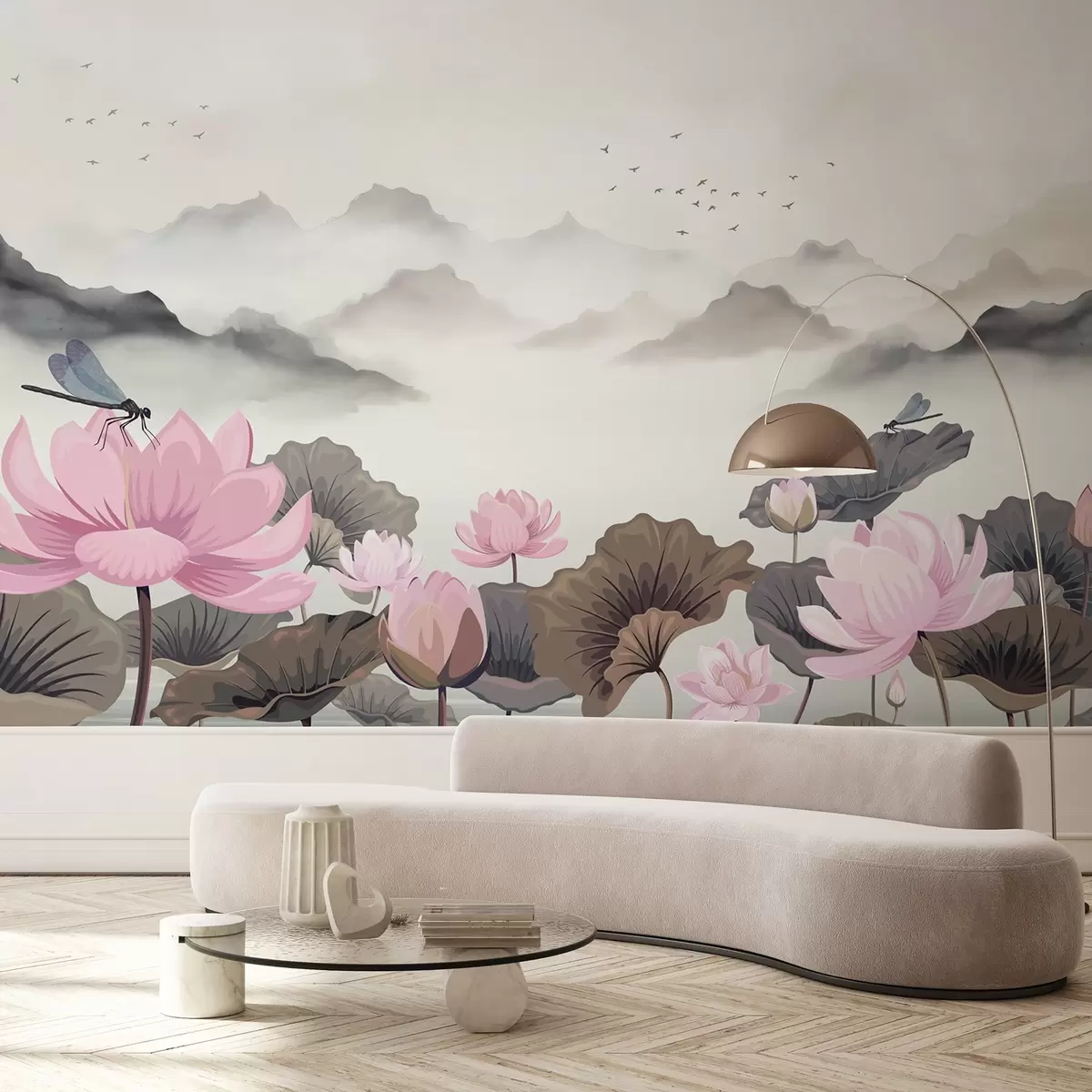 Mountains with birds in a watercolor style, with water lilies and dragonflies in the foreground - Wall mural (No. w08872)