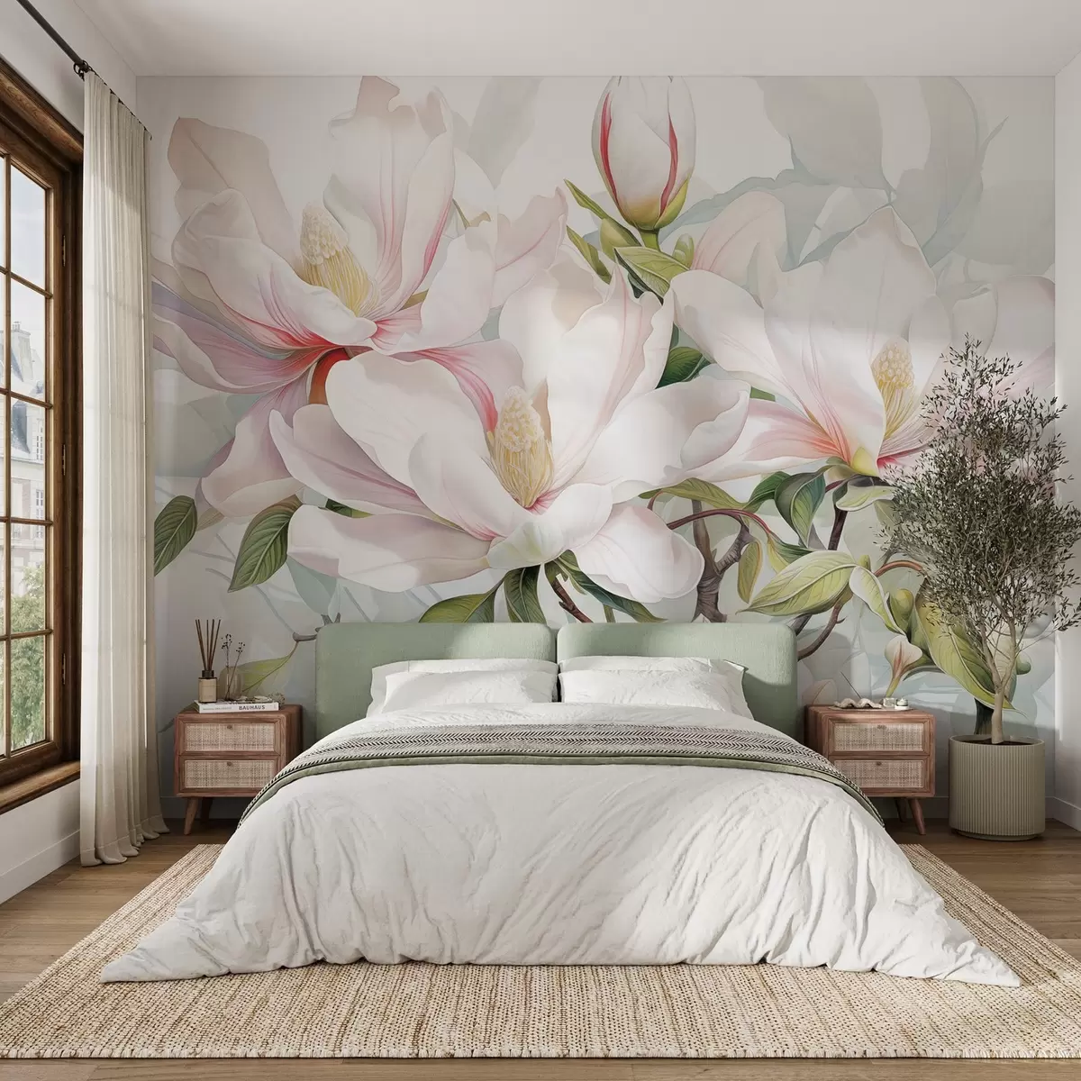 Magnolia flowers with white and pink petals, leaves and brown branches, soft and delicate watercolor style - Wall mural (No. w08885)