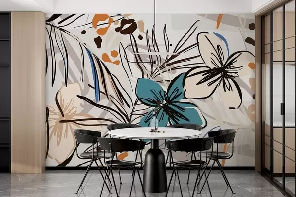 Modern abstract print with tropical palm leaves, blue and beige flowers, black lines, light background - Wall mural (No. w08889)