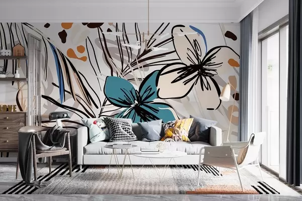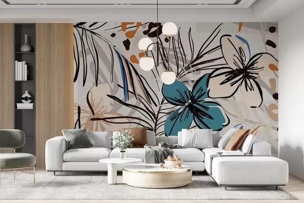 Modern abstract print with tropical palm leaves, blue and beige flowers, black lines, light background - Wall mural (No. w08889)