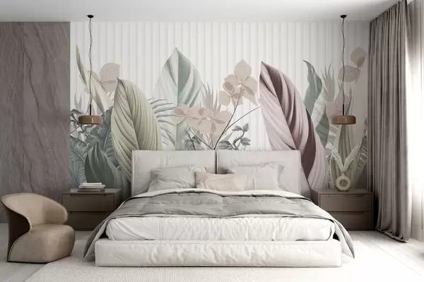Tropical leaves with soft pastel colors, light green , light pink and light brown, vertical lines in the background - Wall mural (No. w08892)