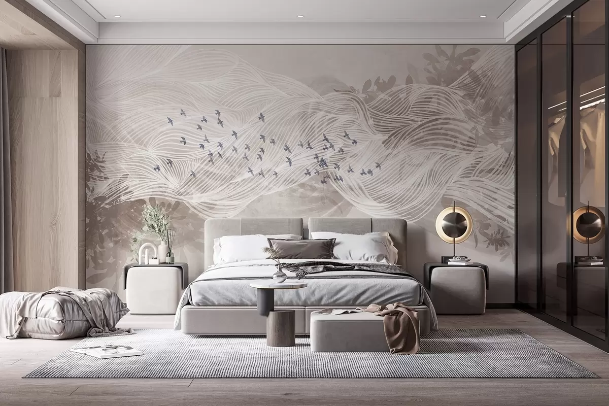 Flock of birds flying over abstract line art landscape textured beige waves, soft colors , minimalist design - Wall mural (No. w08898)