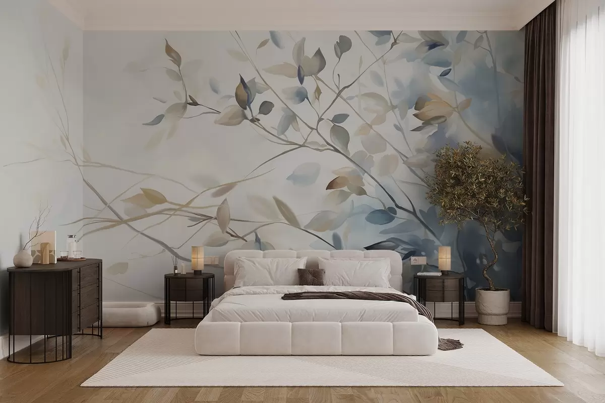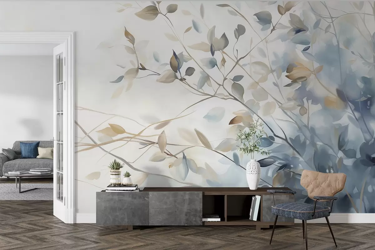 Branches with leaves in blue and brown tones, light background, soft and delicate, watercolor style - Wall mural (No. w08900)