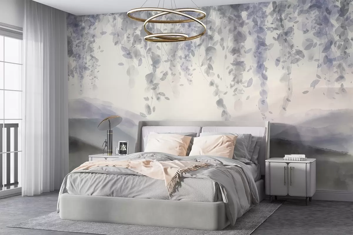 Wisteria leaves hanging over blured mountains, soft pastel blue and gray colors, watercolor style landscape - Wall mural (No. w08909)