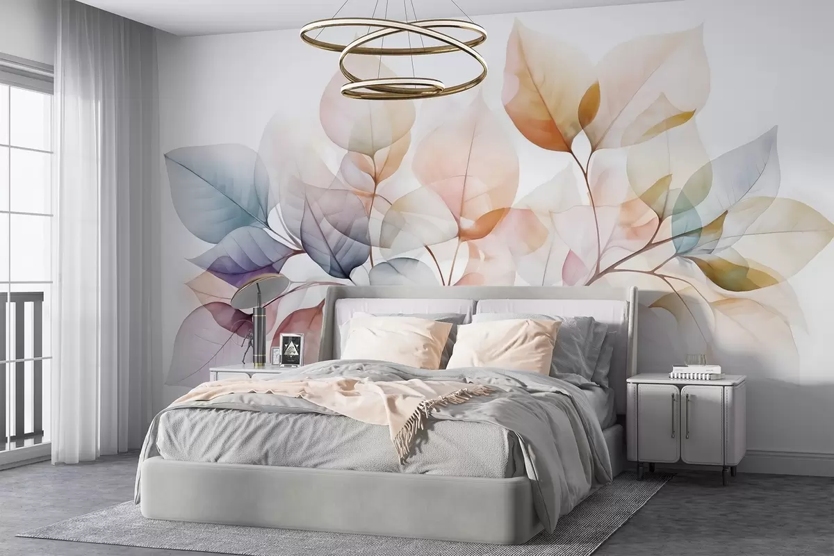 Watercolor painting of translucent leaves in pastel colors, with shades of pink, white, purple, and blue - Wall mural (No. w08910)