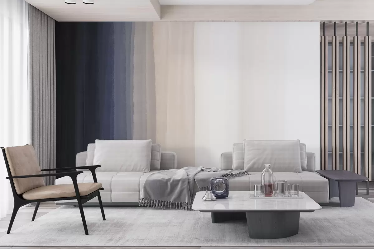 Abstract minimalistic gradient print with vertical stripes of dark blue, light peach and white - Wall mural (No. w08915v1)