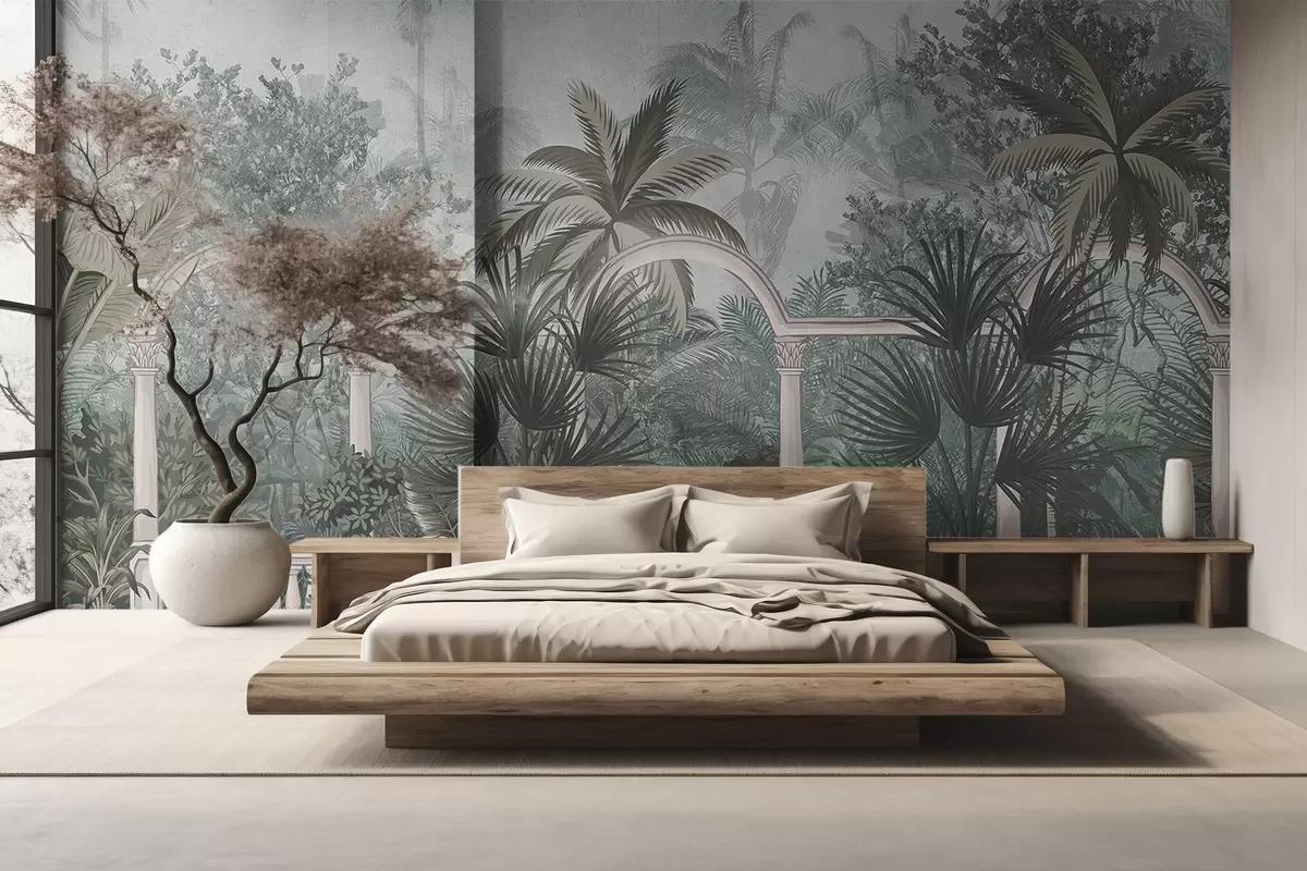 Tropical textured garden with palm trees and lush vegetation, balustrade with arches, muted colors, vintage style - Wall mural (No. w08916)