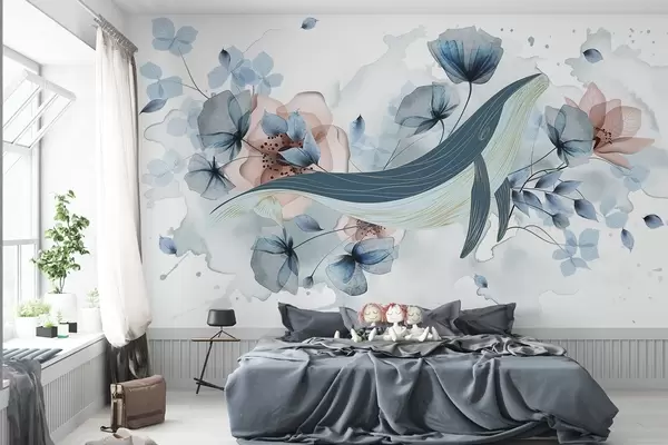 A blue whale with flowers, watercolor style, light blue and pink colors, light background - Wall mural (No. w08922)