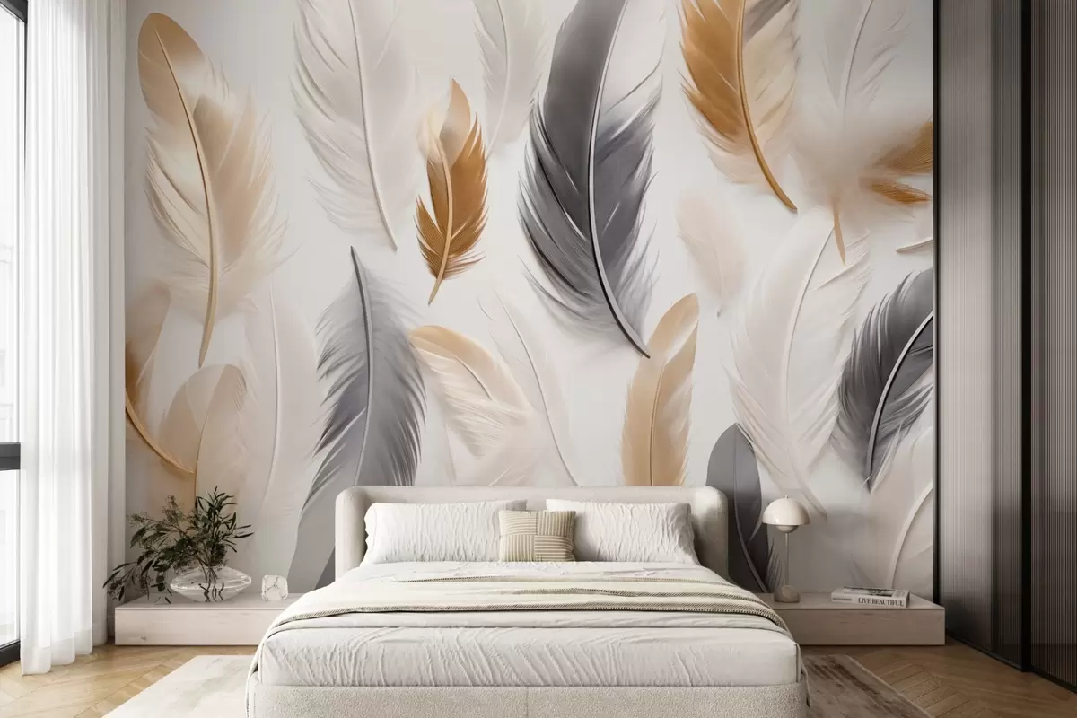 Beige-gray feathers in soft, calm tones - Wall mural (No. w08955)