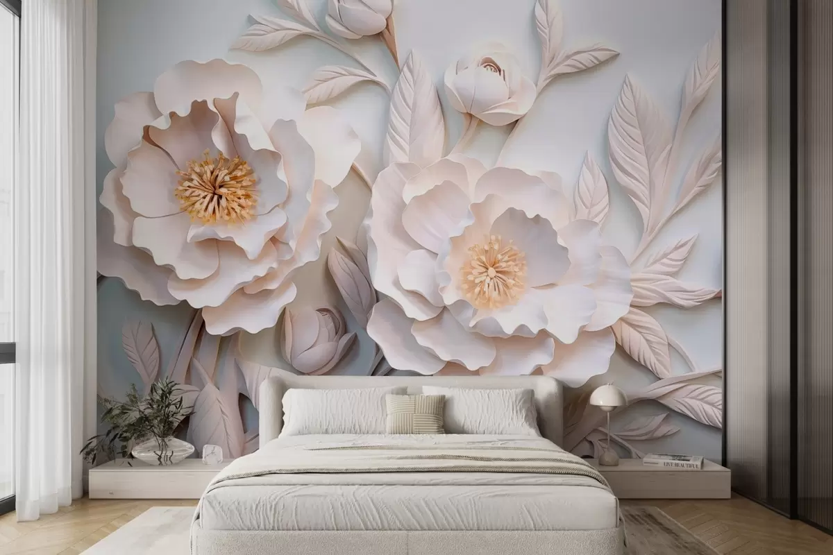 3D relief peonies in fresco style with a yellow accent - Wall mural (No. w08967)
