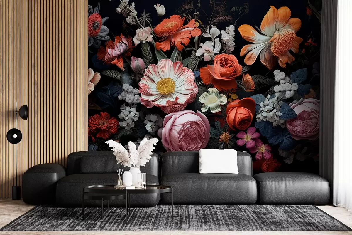 Colorful bouquet of various flowers on a dark background in cool tones - Wall mural (No. w08969v1)