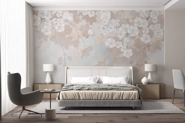 Cherry blossom branches with white flowers and grey leaves, on elegant floral silhouettes in soft pastel colors - Wall mural (No. w08973)