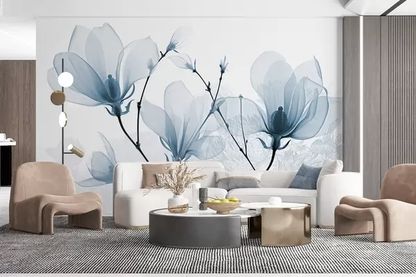 Translucent blue magnolia flowers with flowers silhouettes with delicate petals and dark stems - Wall mural (No. w08978)
