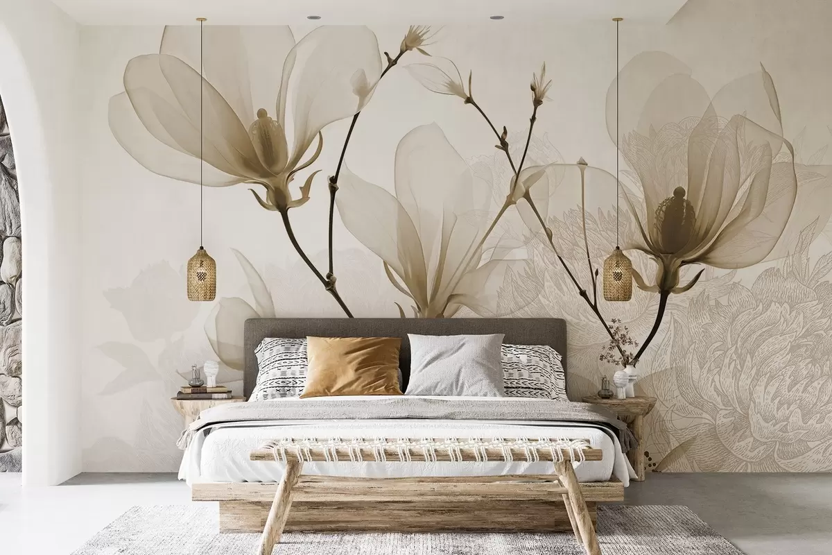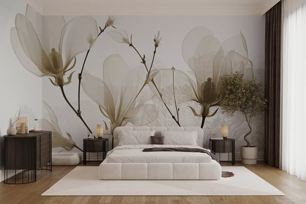 Translucent beige magnolia flowers with flowers silhouettes with delicate petals and dark stems - Wall mural (No. w08978v1)