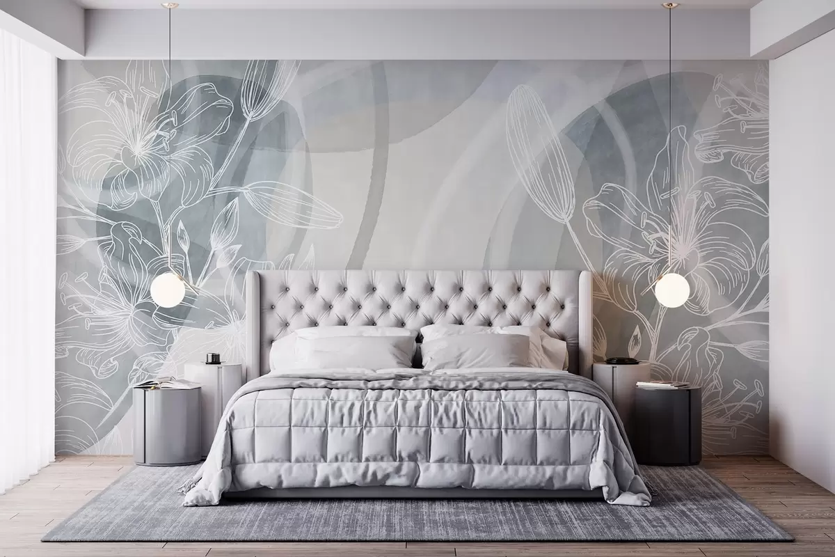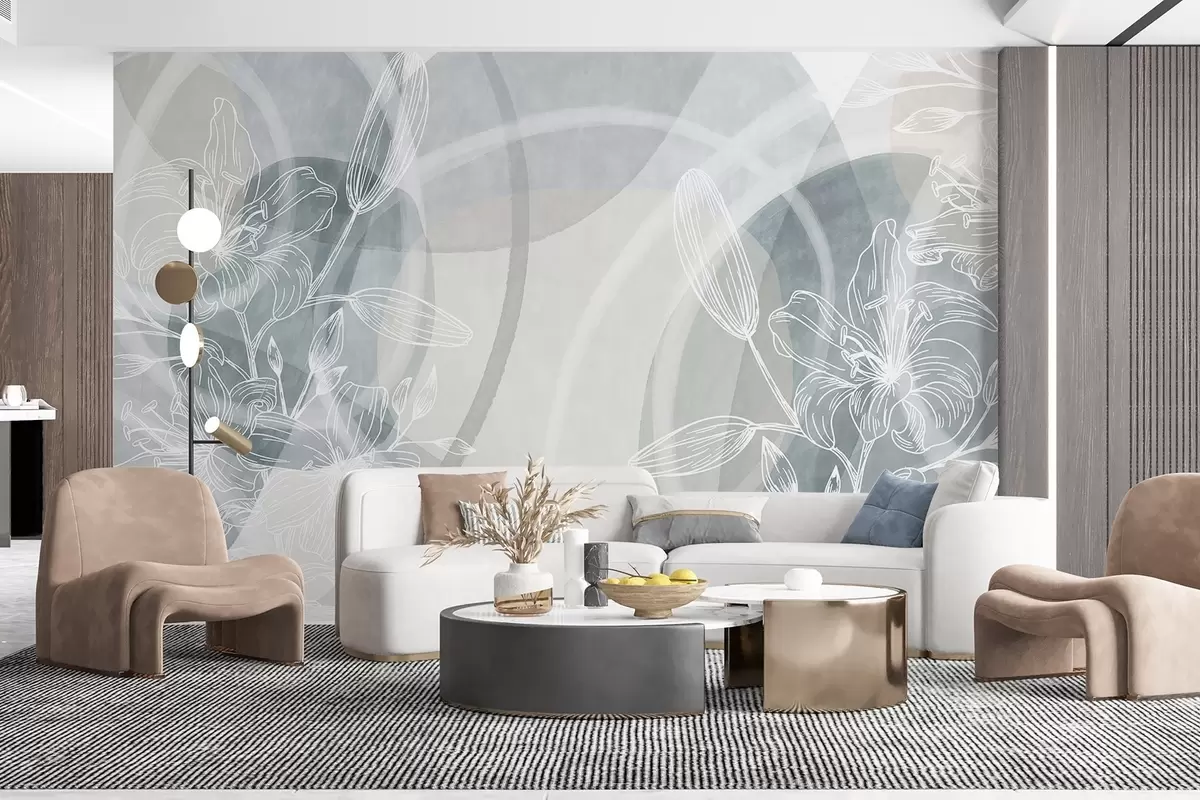 Minimalist floral design with white line art flowers and leaves, overlapping abstract circles in shades of gray and blue - Wall mural (No. w08979)