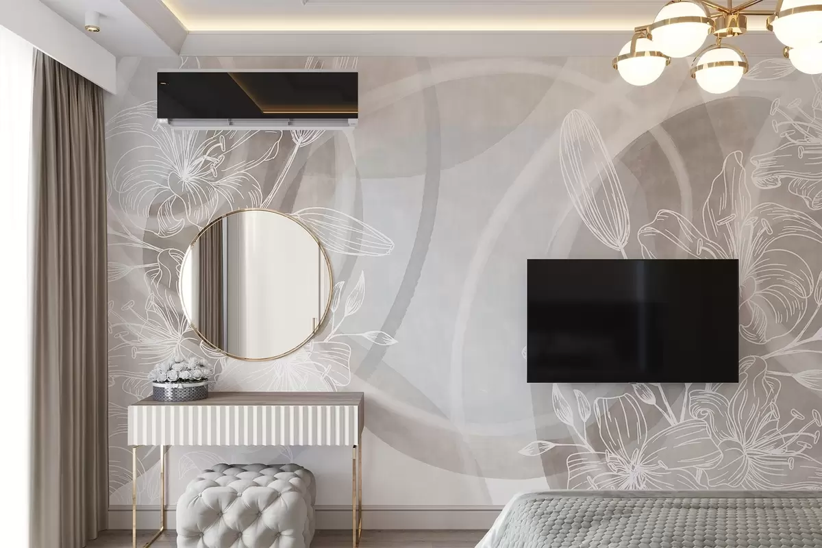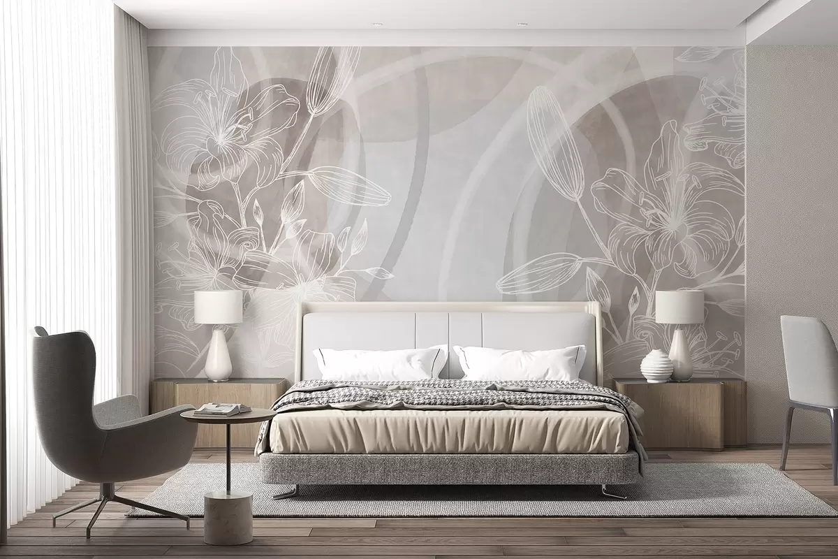 Minimalist floral design with white line art flowers and leaves, overlapping abstract circles in shades of beige and blue - Wall mural (No. w08979v1)