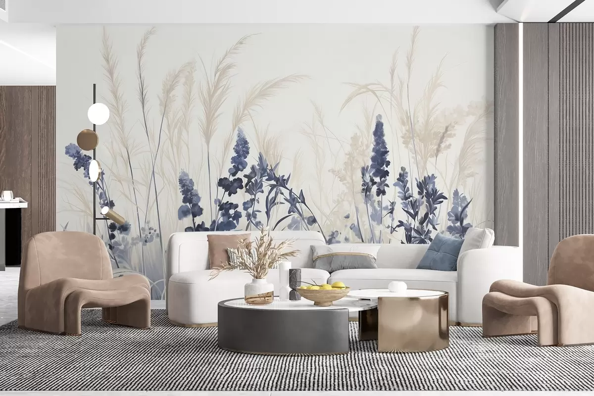 Blue flowers and beige reeds in a field, minimalistic painting texture, light background, soft colors, delicate brushstrokes - Wall mural (No. w08982)