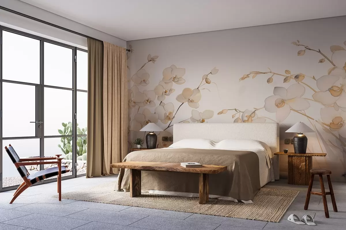 Beige orchids growing on the sides in water in watercolor style - Wall mural (No. w08998)