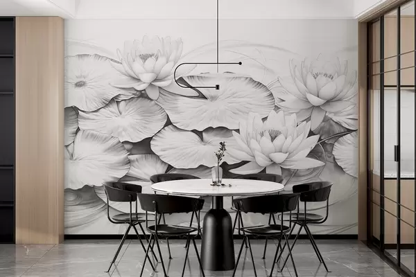 Water lilies and lily pads in a pond, black and white imitation of pencil drawing, detailed botanical illustration, nature art - Wall mural (No. w09006)
