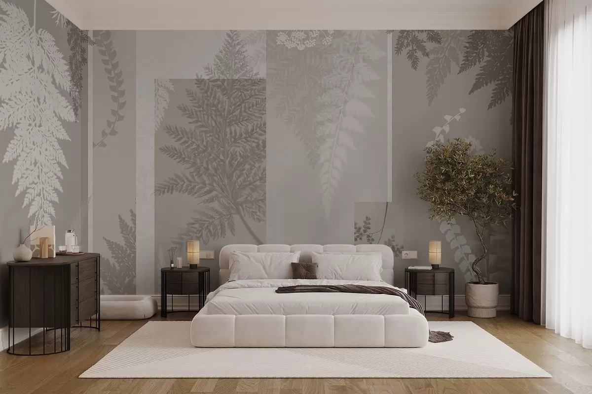 Fern leaves in beige and white, arranged in vertical stripes, creating a botanical and minimalist print, soft and muted colors - Wall mural (No. w09007)