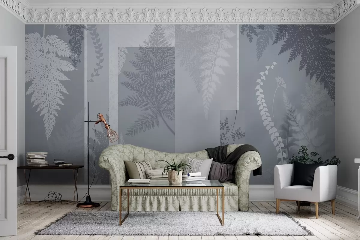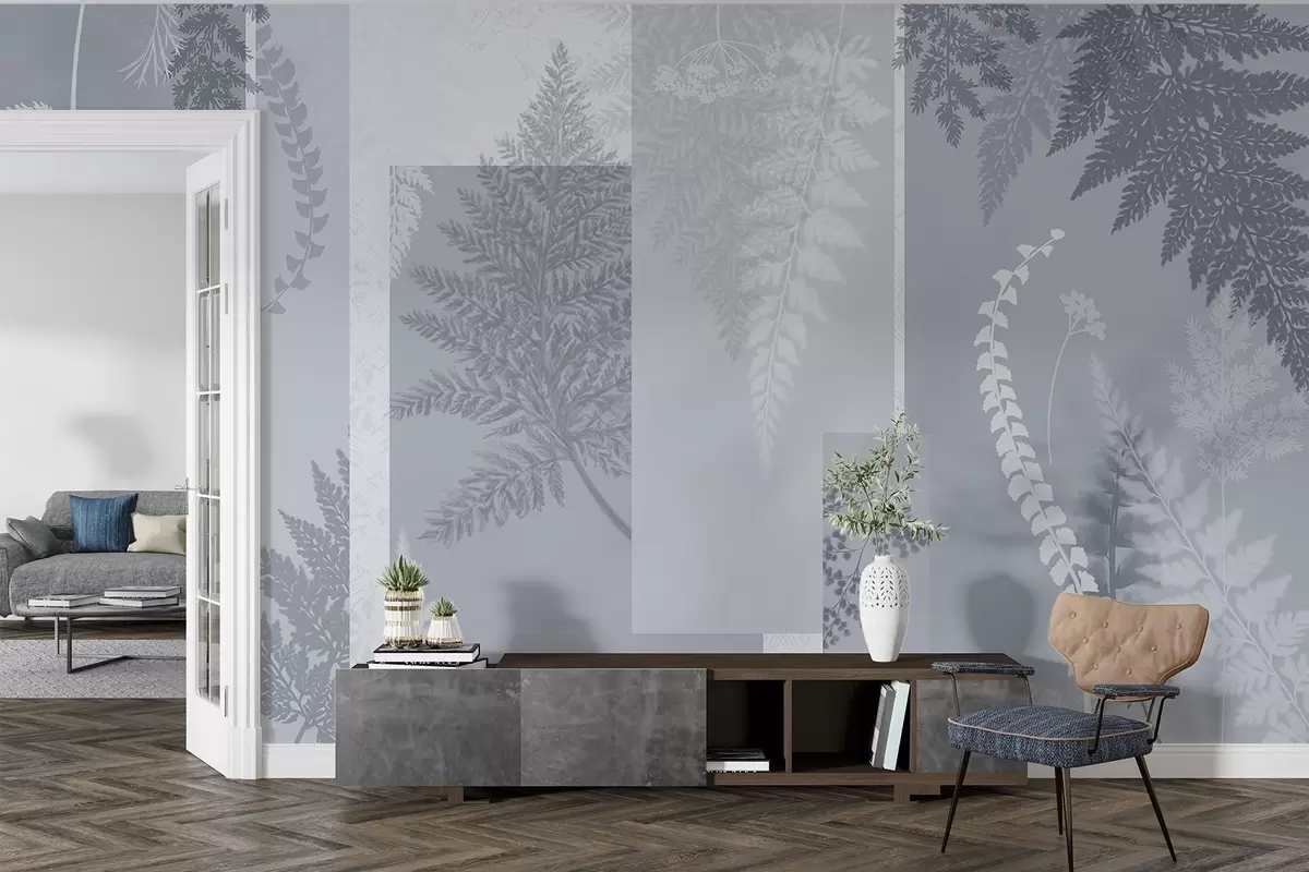 Fern leaves in blue and white, arranged in vertical stripes, creating a botanical and minimalist print, soft and muted colors - Wall mural (No. w09007v1)