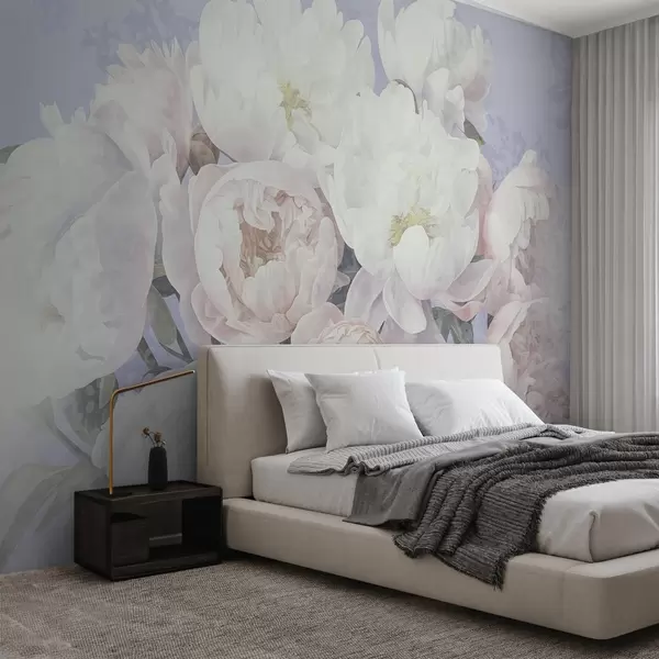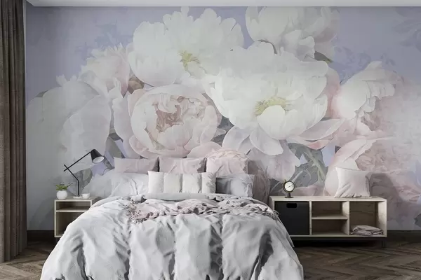 Textured abstract peach and white peonies with green leaves, light background, soft and delicate colors, vintage style - Wall mural (No. w09008v1)