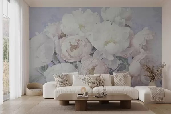 Textured abstract peach and white peonies with green leaves, light background, soft and delicate colors, vintage style - Wall mural (No. w09008v1)