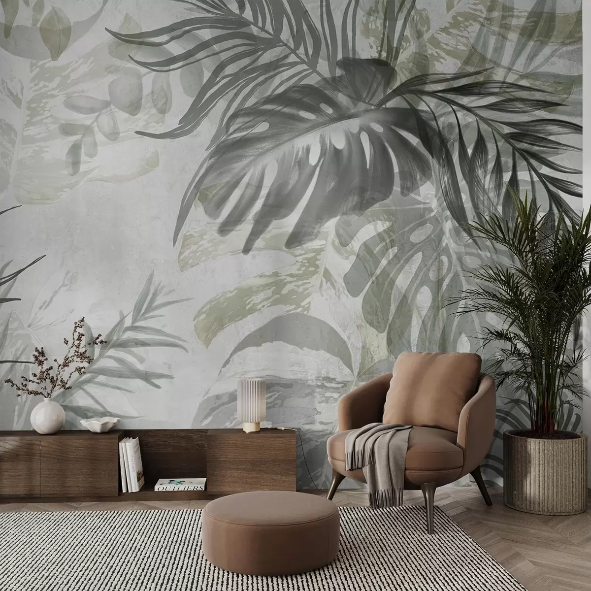 Monstera and palm leaves in shades of green and gray, botanical, tropical foliage, jungle plants, textured background - Wall mural (No. w09011)