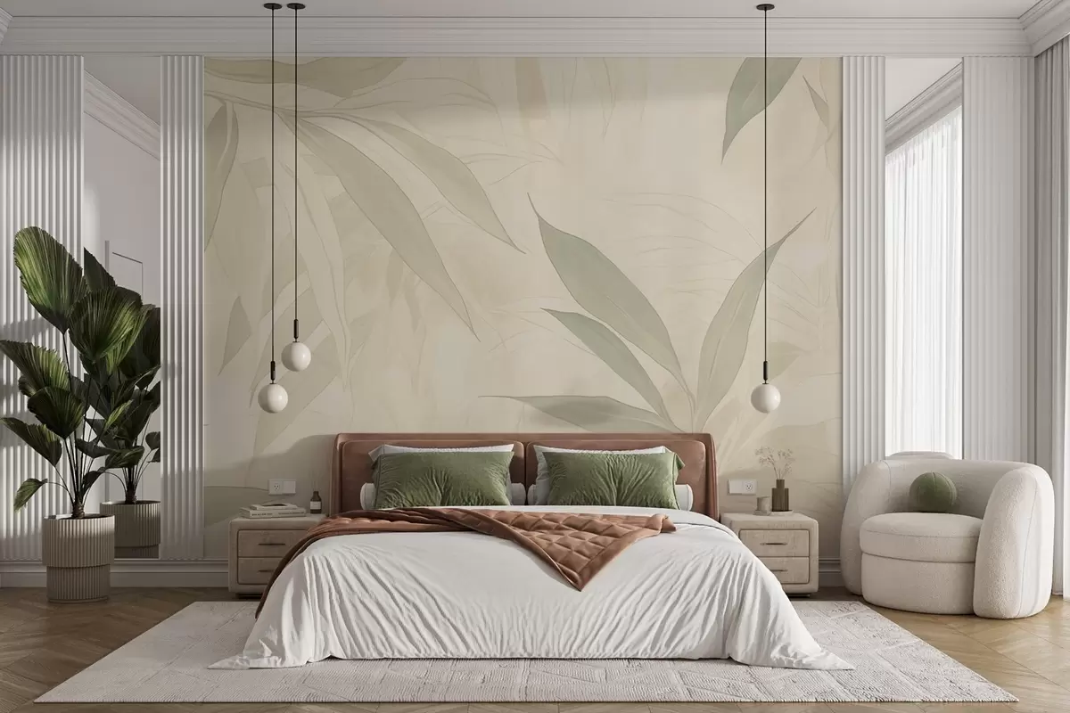 Branches with leaves in soft green tones on a beige background - Wall mural (No. w09027)