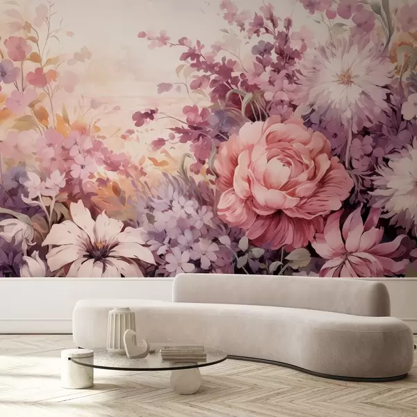 Colorful flowers in pink and purple tones: lilacs, peonies, chrysanthemums - Wall mural (No. w09039)