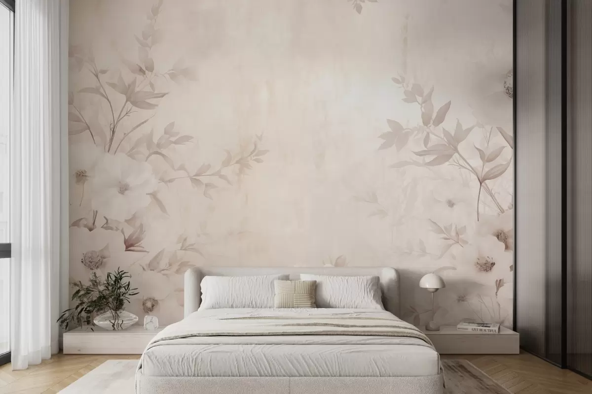 Flowers with leaves in neutral light tones in watercolor style - Wall mural (No. w09040)